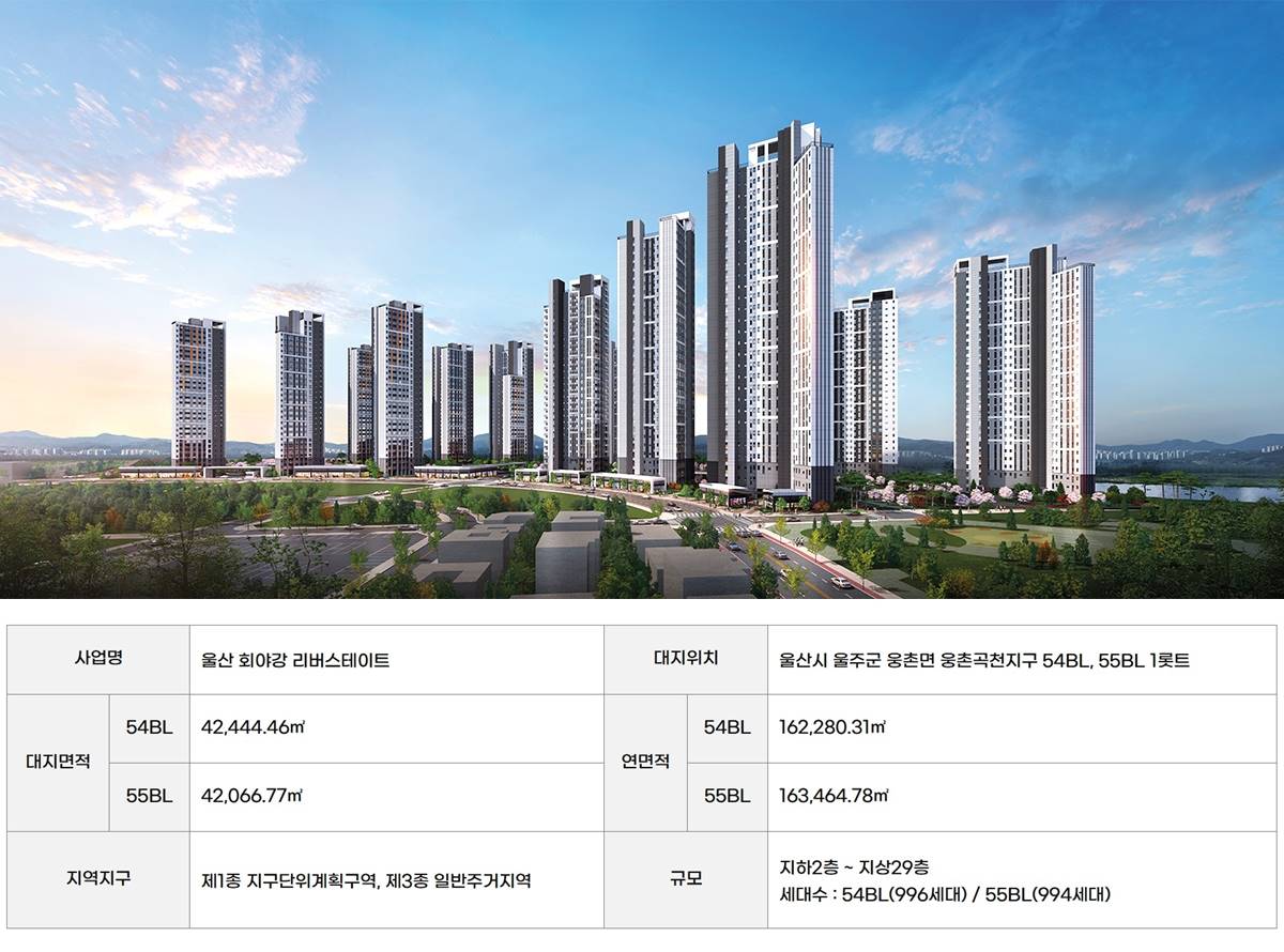 탁 트인 회야강 영구 조망 프리미엄 자연과 함께 숨 쉬는 리버사이드 뷰의 희소 가치 단지 바로 앞 회야강이 흐르는 영구 조망권을 확보하여 일상 속에서 강변의 여유와 아름다운 사계절 경관을 온전히 누릴 수 있습니다. 총 1,724세대 초대형 매머드급 단지 울산 울주군을 대표하는 압도적인 주거 랜드마크 총 1,724세대에 달하는 대규모 단지 조성으로 대단지 프리미엄과 함께 안정적인 관리비 시스템 및 우수한 주거 환경을 제공합니다. 최고 29층 높이의 웅장한 스카이라인 지역의 위상을 높이는 고품격 건축 설계와 단지 구성 지하 2층부터 최고 29층 높이로 건설되어 회야강변의 새로운 랜드마크로서 자부심 높은 주거 가치를 선사합니다. 울산과 부산을 잇는 광역 교통의 요충지 7번 국도 및 동해남부선 광역철도의 우수한 접근성 7번 국도 우회도로를 통해 울산 남구와 부산으로의 이동이 빠르며, 광역철도망을 통한 편리한 출퇴근 여건을 갖추었습니다. 주변 산업단지 직주근접의 최적지 온산국가산단 및 주요 일반산단 배후 주거지 입지 온산국가산업단지와 인접하여 풍부한 배후 수요를 확보함과 동시에 빠른 출퇴근이 가능한 직주근접의 매력을 더했습니다. 단지 내 대형 커뮤니티 및 테마 공원 입주민의 건강과 휴식을 고려한 원스톱 라이프 피트니스 센터, 골프연습장 등 고품격 시설과 회야강 산책로와 연결되는 조경 설계로 삶의 질을 획기적으로 높입니다. 가장 선호되는 중소형 실용 평면 전 세대 남향 위주 배치 및 혁신적인 공간 미학 실수요자 선호도가 높은 중소형 위주 평형으로 구성되어 채광과 통풍이 우수한 쾌적한 주거 공간을 완성했습니다.